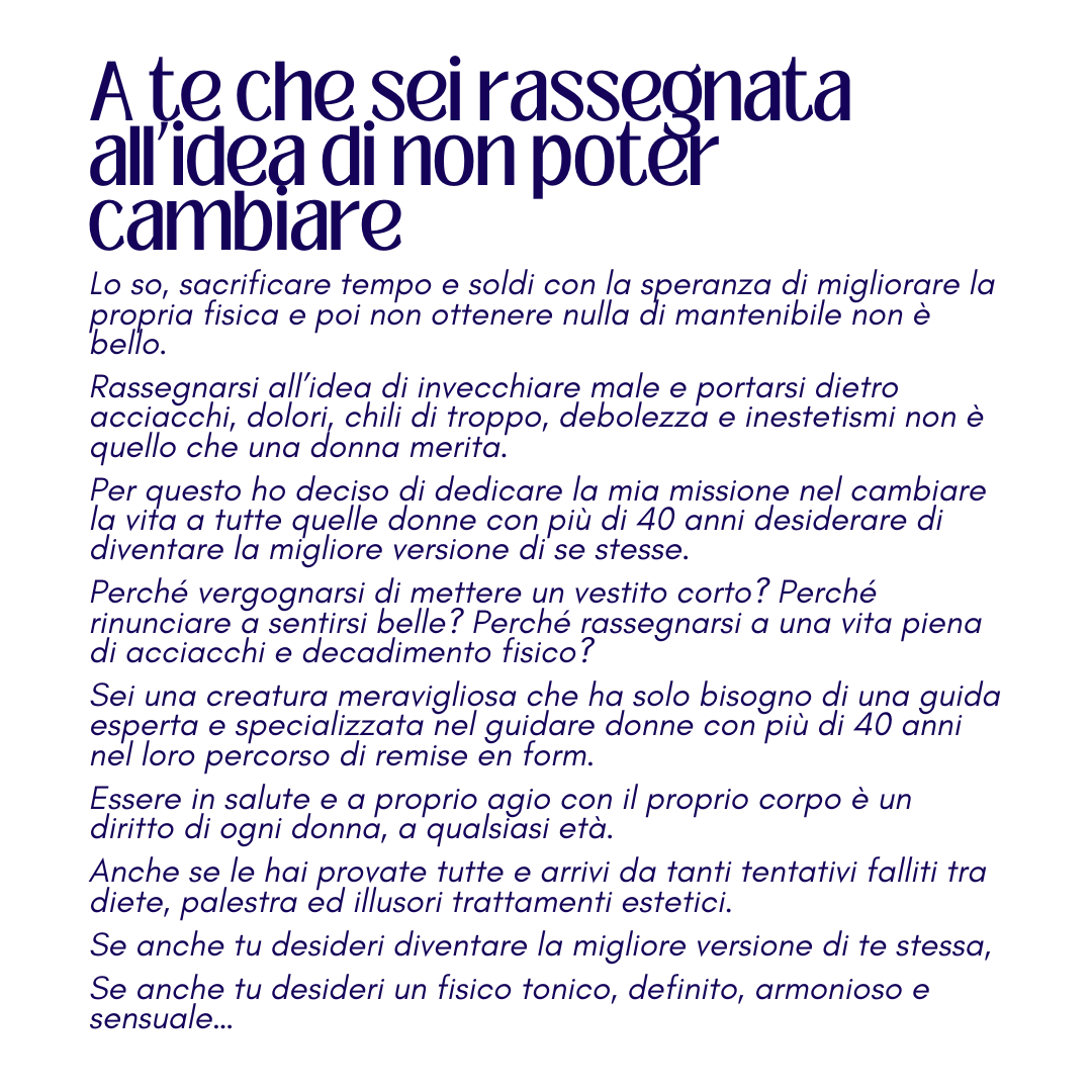 Ciao, sono Sara Colombo e sono la fitness coach specializzata nell’allenamento femminile: aiuto le donne a raggiungere i loro obiettivi fisici, estetici e di benessere. E lo faccio in maniera strettamente personalizzata in base alle tue esigenze specifiche e alla tua condizione di partenza.